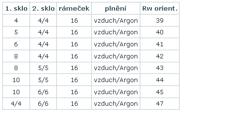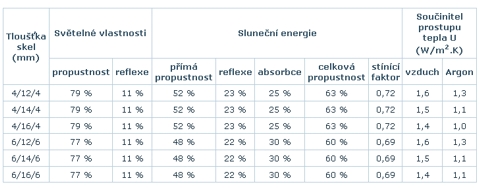 Standardní izolační sklo ve složení s Pilkington OptifloatTM má hodnotu U = 2,9 W/m2 . K. Z hlediska úspory energií i z hlediska omezení vzniku rosného bodu na povrchu skla doporučujeme použití skel s nízkoemisivní vrstvou.